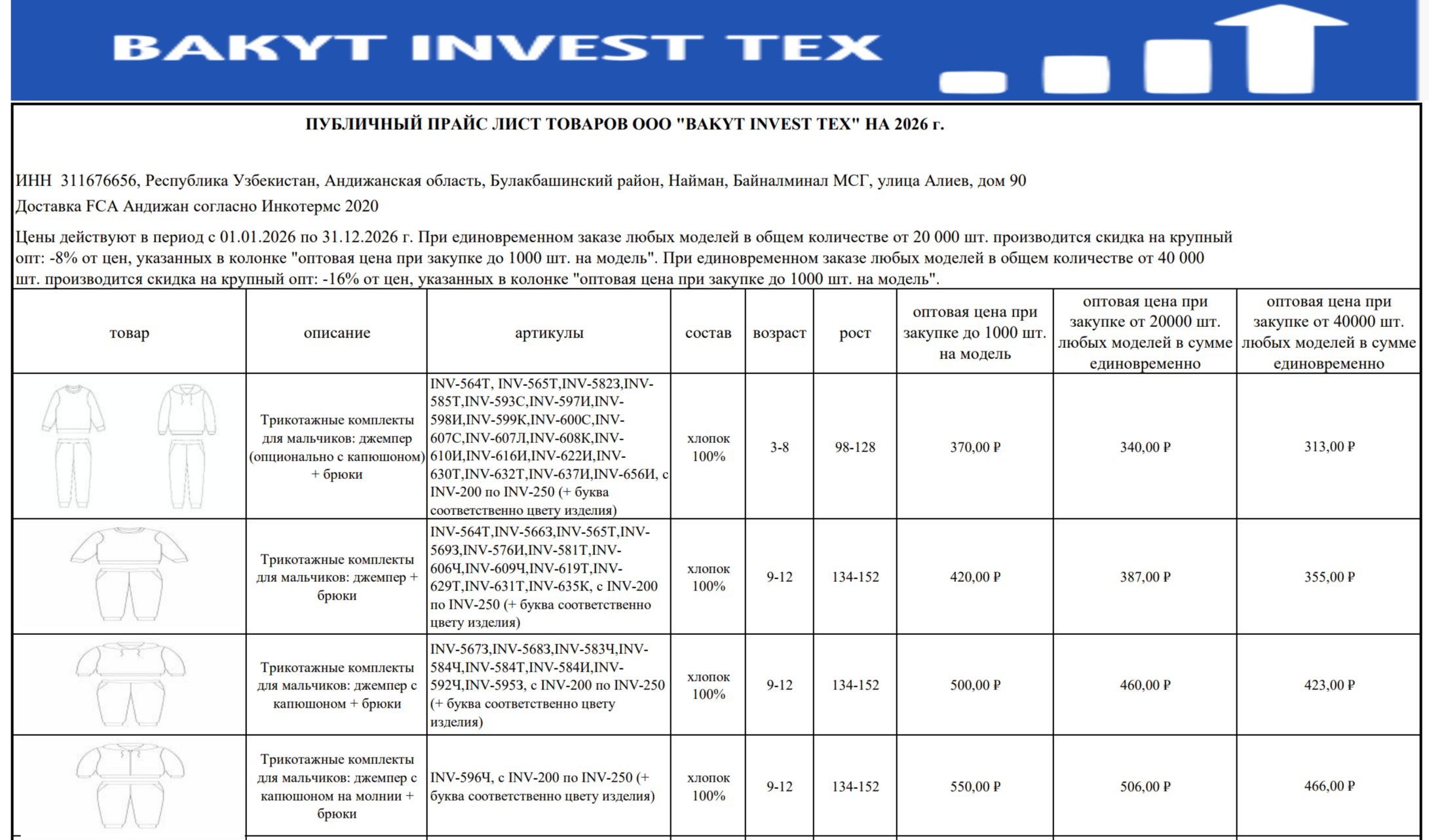 Добро пожаловать на сайт швейной компании «BAKYT INVEST TEX», специализирующейся на производстве детского трикотажа! Мы гордимся тем, что занимаемся созданием качественной и уютной одежды.